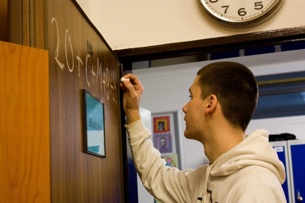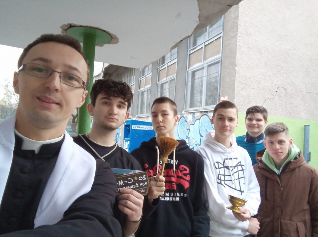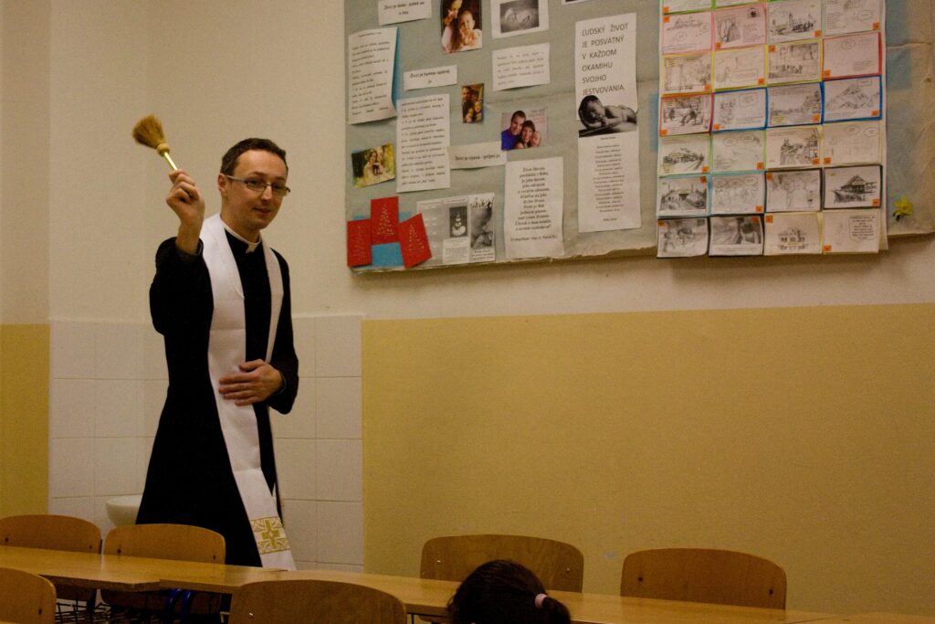 Páter Peter požehnal našu školu v prvých dňoch nového roka. Po krátkej modlitbe cez školský rozhlas v sprievode starších žiakov putoval od jednej triedy k druhej a nezabudol prehodiť povzbudivé slová.