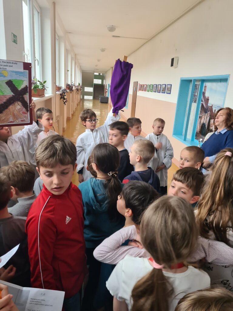 Dňa 26.3.2026 sa v našej škole uskutočnila spoločná modlitba krížovej cesty. Hoci sme pôvodne plánovali kráčať po školskom dvore, nepriaznivé počasie nás nasmerovalo do interiéru školy. Po chodbách školy sme sa modlili za všetkých žiakov, rodičov, pedagógov i priateľov školy. Po modlitbe nám p. vychovávateľky a vychovávatelia pripravili malé občerstvenie za dobrovoľný príspevok. Výťažok išiel na charitu. Ďakujeme všetkým zúčastneným za vytvorenie hlbokej a dôstojnej atmosféry.