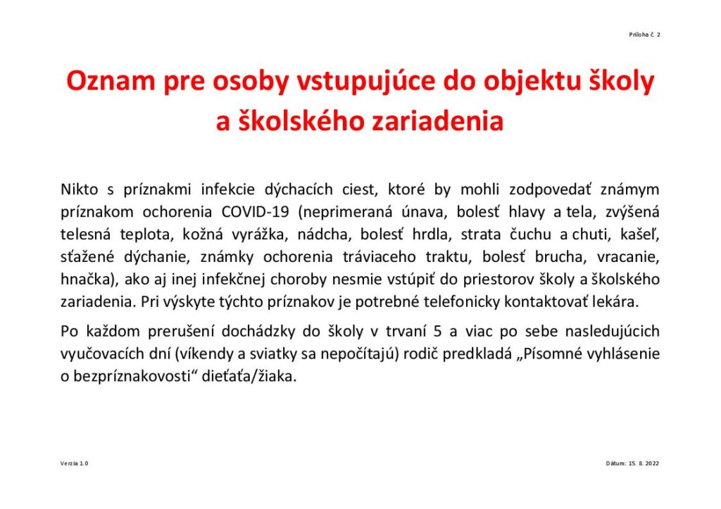 Prečítajte si oznam od ministerstva školstva pre osoby vstupujúce do objektu školy a školského zariadenia.